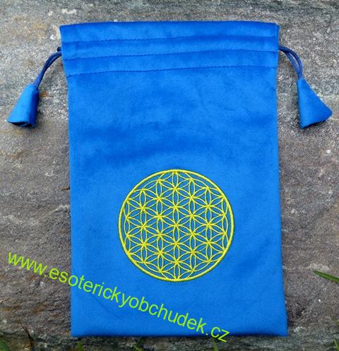 - Sáček velký 14 x 20 cm s výšivkou KVĚT ŽIVOTA (žlutá výšivka) - modrý samet