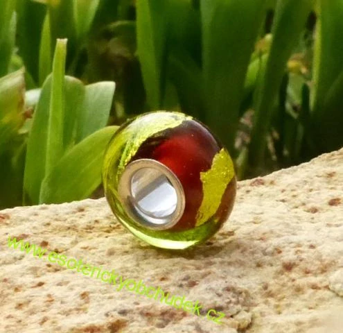 Zeleno-zlatohnědý korálek z muránského skla (ručně vyrobený). Zeleno-zlatý třpyt bohužel na obrázku není jasně viditelný